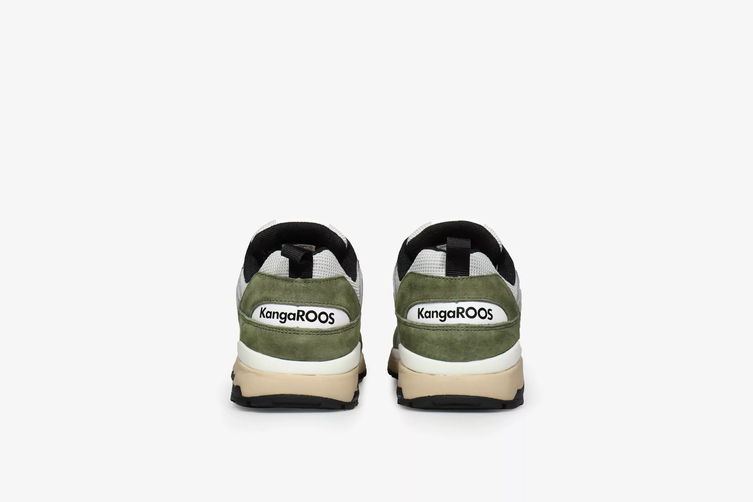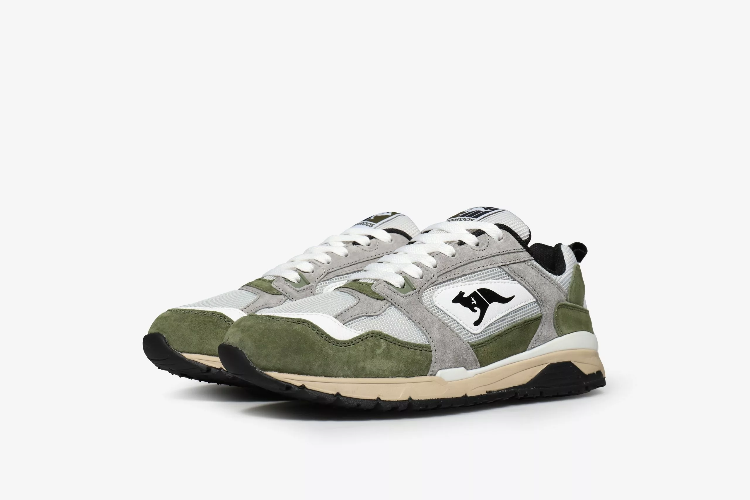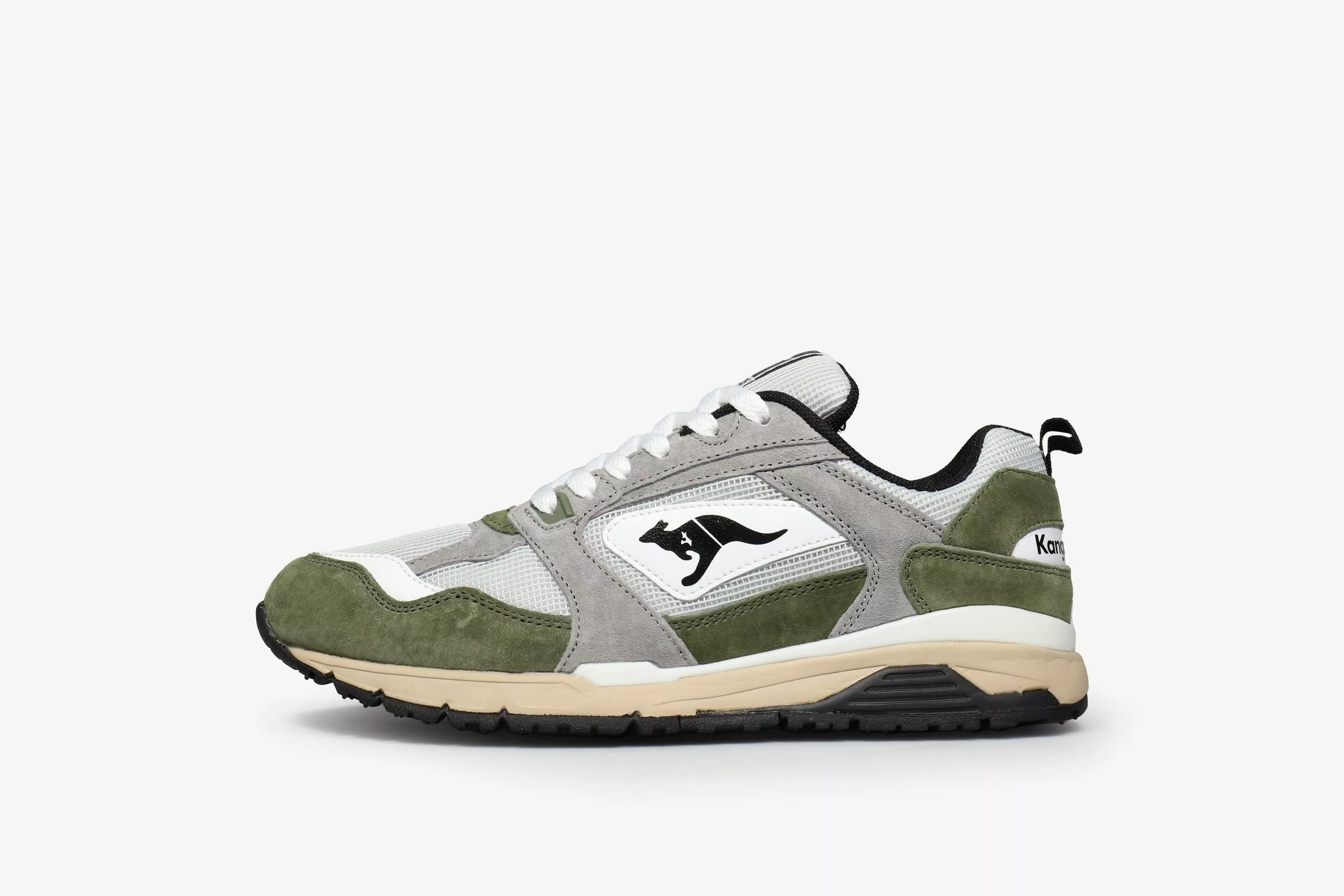 The German footwear aficionados take the EXO model up a gear with their Ultimate rendition. A mesh upper is supported by suede and leather overlays and this pair’s olive and grey colourway is applied seamlessly to the mixed material upper for maximum affect. The KangaROOS logo adorns the lateral and medial side of the shoe, with a typographic logo printed on the heel. The foam midsole has a beige tint that offsets the colour palate, with a black rubber outsole wrapping around it.