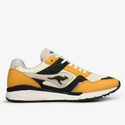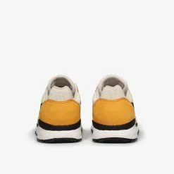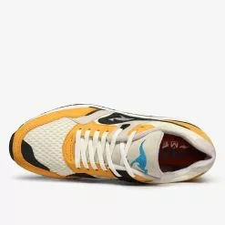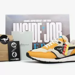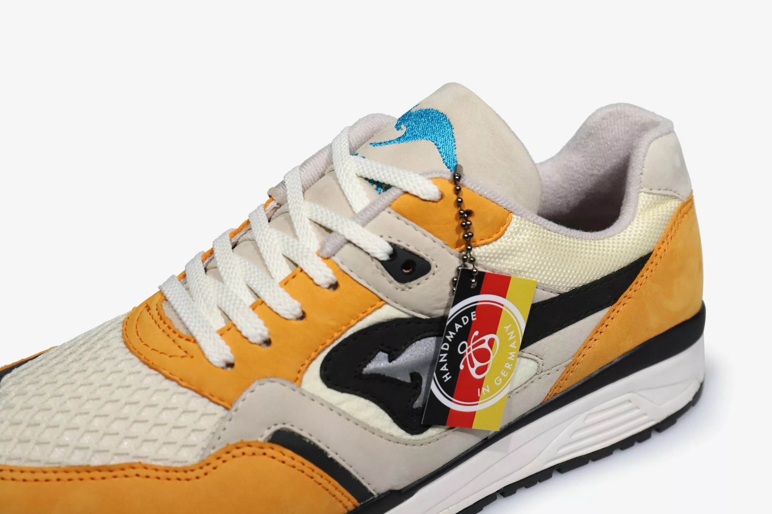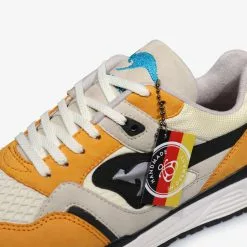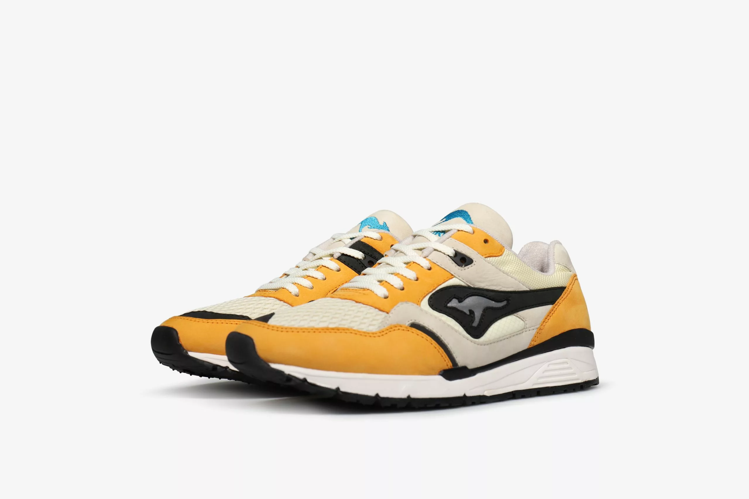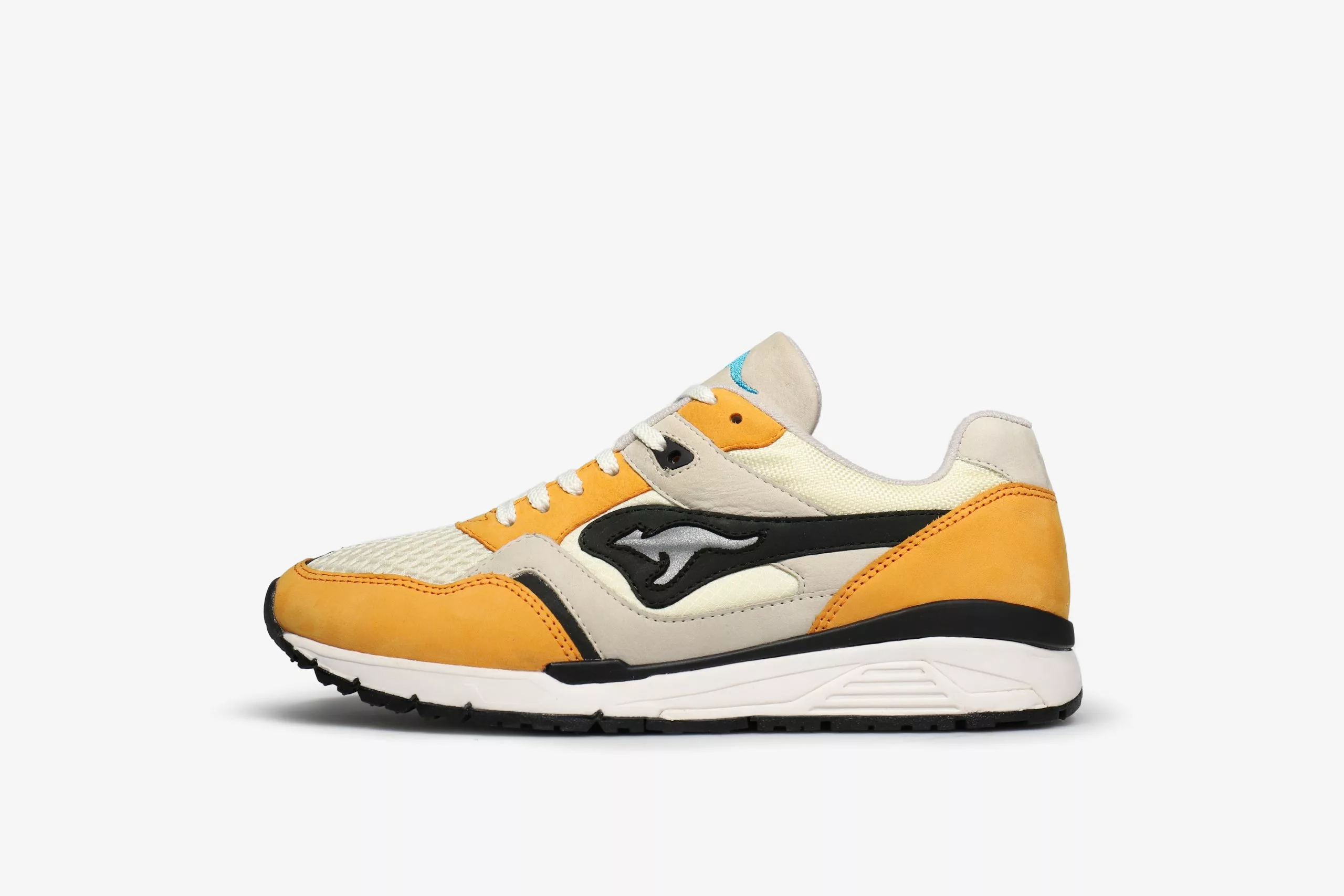 Overlays of buttery SAFFRON yellow nubuck rest atop a base of soft white mesh sourced from the surrounding areas of the KangaROOS factory in Pirmasense, Germany. A hit of LASER BLUE on the tongue logo provides a pop of contrast against the warm tones of the upper. A novel use of reflective black and grey material spans the mudguard, toebox and ROOS logo – a subtle detail matched only by the medial-flip mesh which sees the placements of ballistic nylon and rip-stop reversed. Less subtle is the flipped colourway, with black featuring more prominently on the instep panels. Limited to only 400 units, the heel features individually stamped serial numbers designating a build ###/400 on every pair.