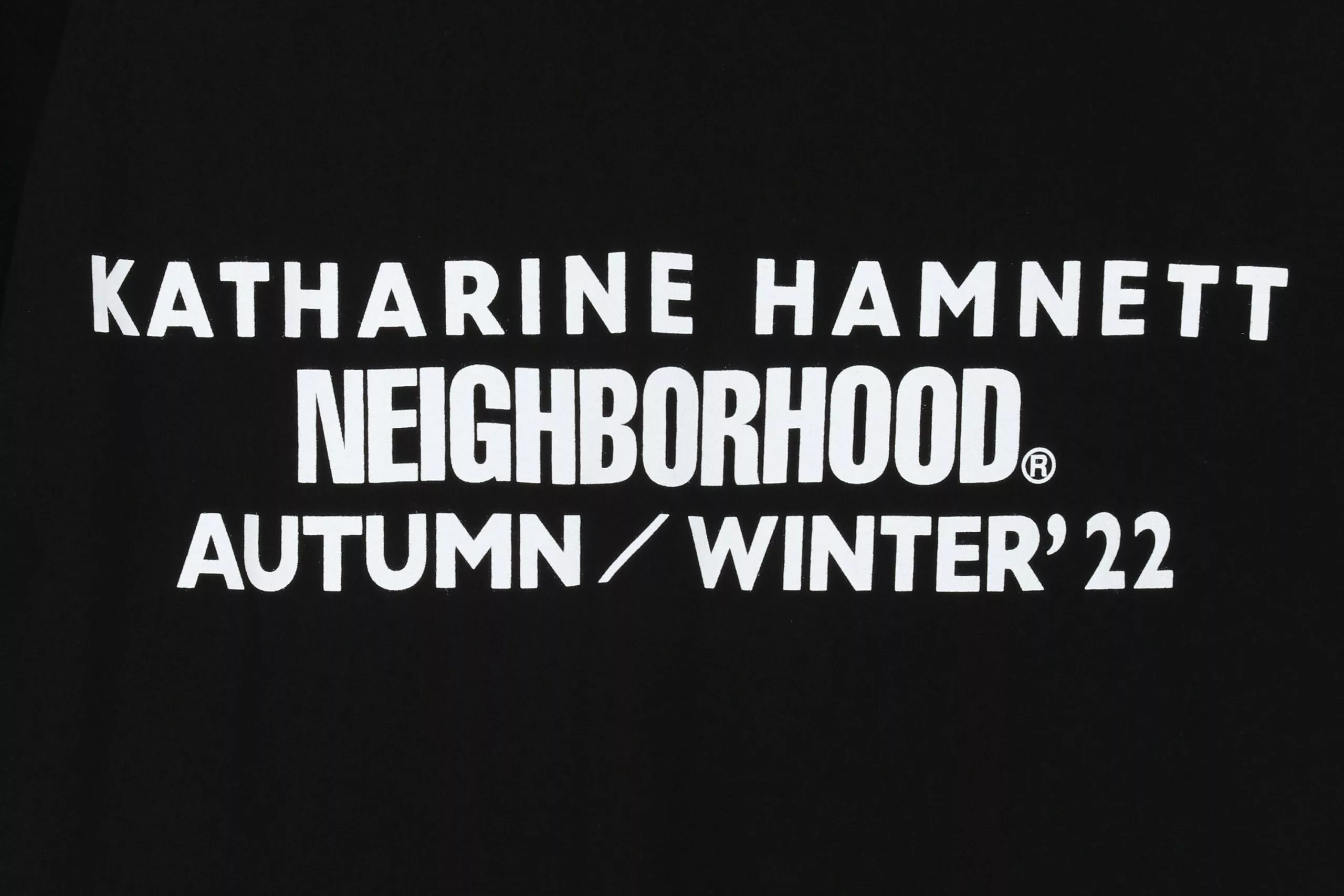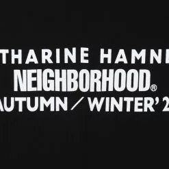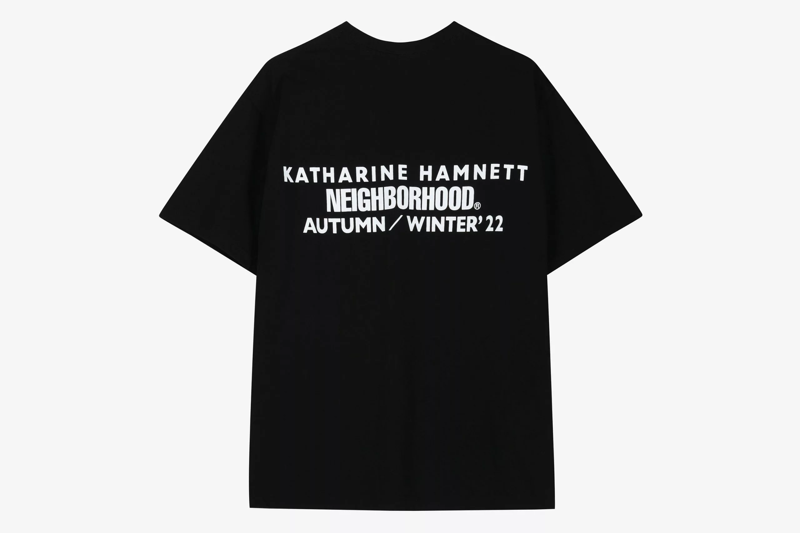 Neighborhood collaborates with Katharine Hamnett on a politically driven capsule that delivers messages from the core of 80s New Wave and various facets of club culture. The collection draws on Hamnett’s archival works, with her bold typographic works gaining critical acclaim in he fashion scene as well as wider pop culture. Rubber printed on a 100% cotton T-shirt with a special collaboration woven label.