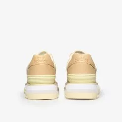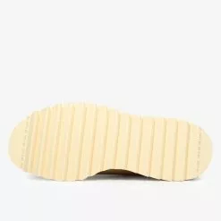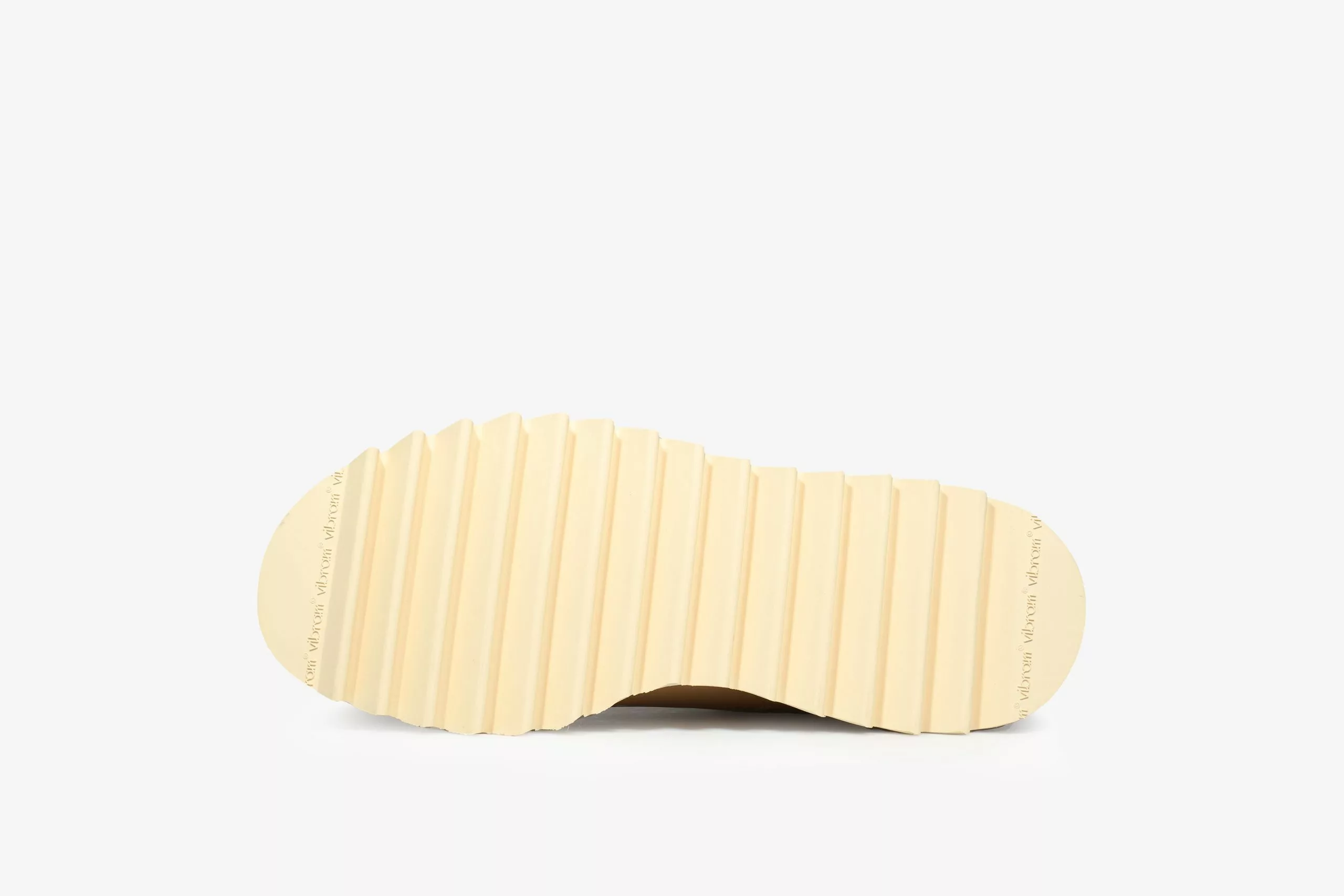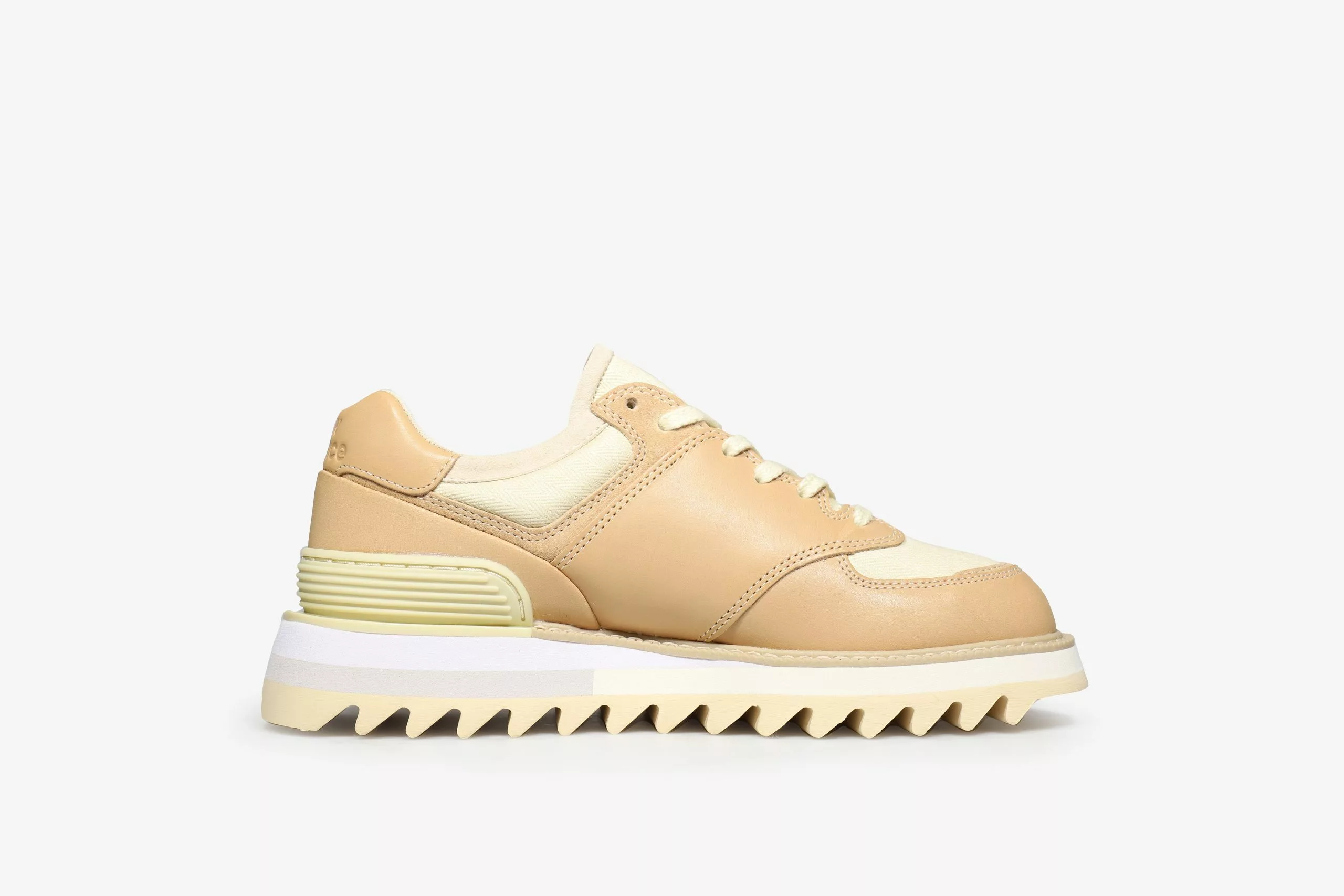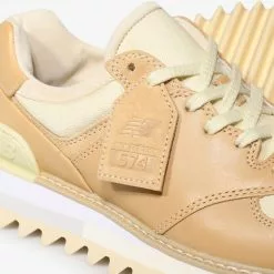 New Balance’s Tokyo Design Studio produces the 574 in this luxe “Vachetta Tan” make up, featuring a herringbone-patterned cotton body with thick vegetable tanned leather overlays around the toe box, quarter section and along the heels. Minimal branding keeps the design squeaky clean with just a debossed New Balance type logo at the heel tab, embossed NB logo on the TPU heel clip and a leather fob attached to the laces. A chunky EVA midsole sits above a lugged Vibram® outsole providing comfort, durability and reliable traction.