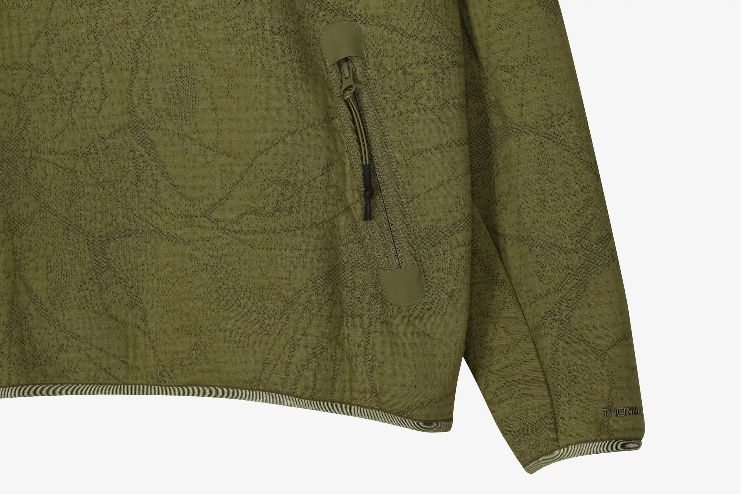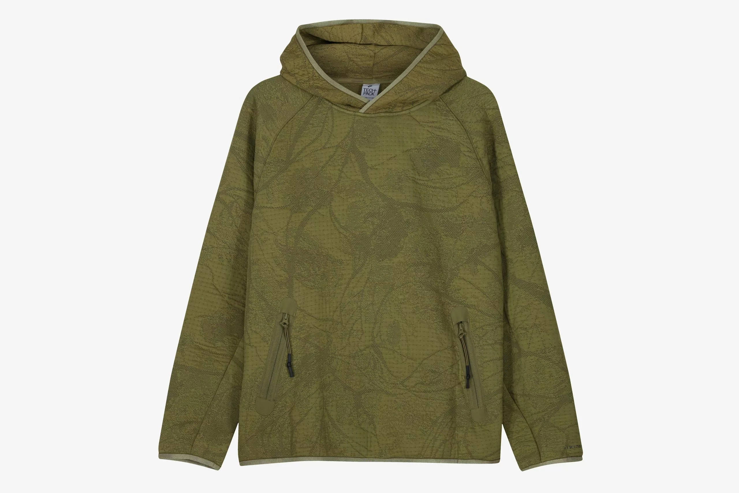 Nike offers up a decorative version of the hooded fleece, using Therma Fit ADV Technology that ensures comfort and insulation. The fleece has a floral pattern across the whole garment, accompanied with an embroidered Nike swoosh on the sleeve. Cuffed hems and sleeves keep the garment fitted secured to the body, while offering good range of motion. Two front pockets are secured by zip and provide another element of practicality to the garment.