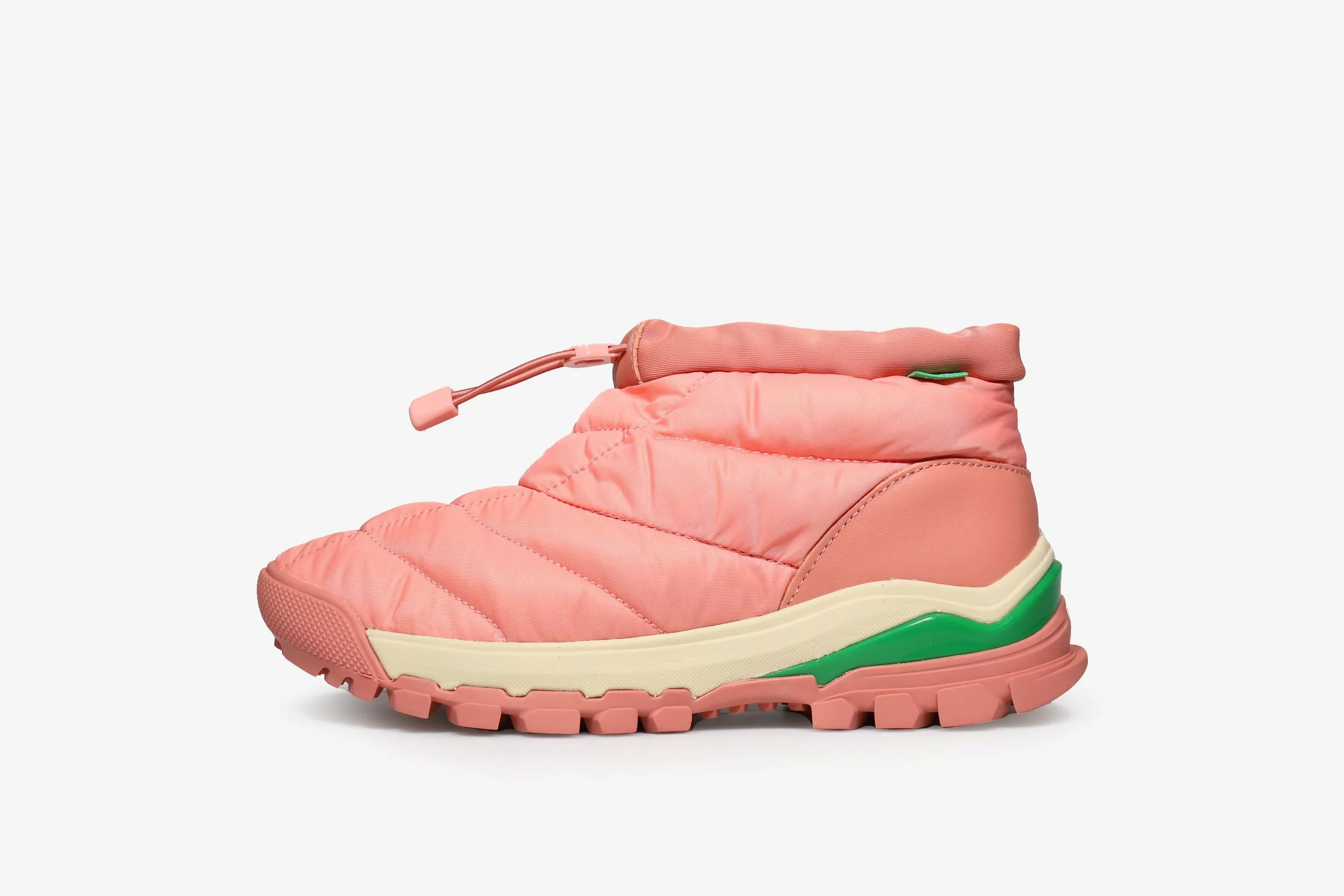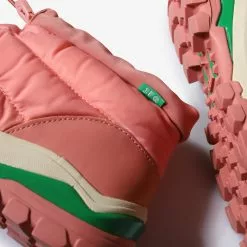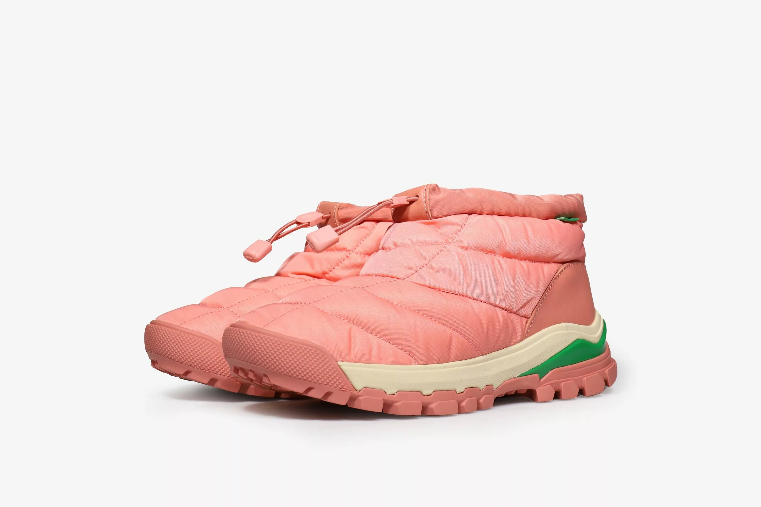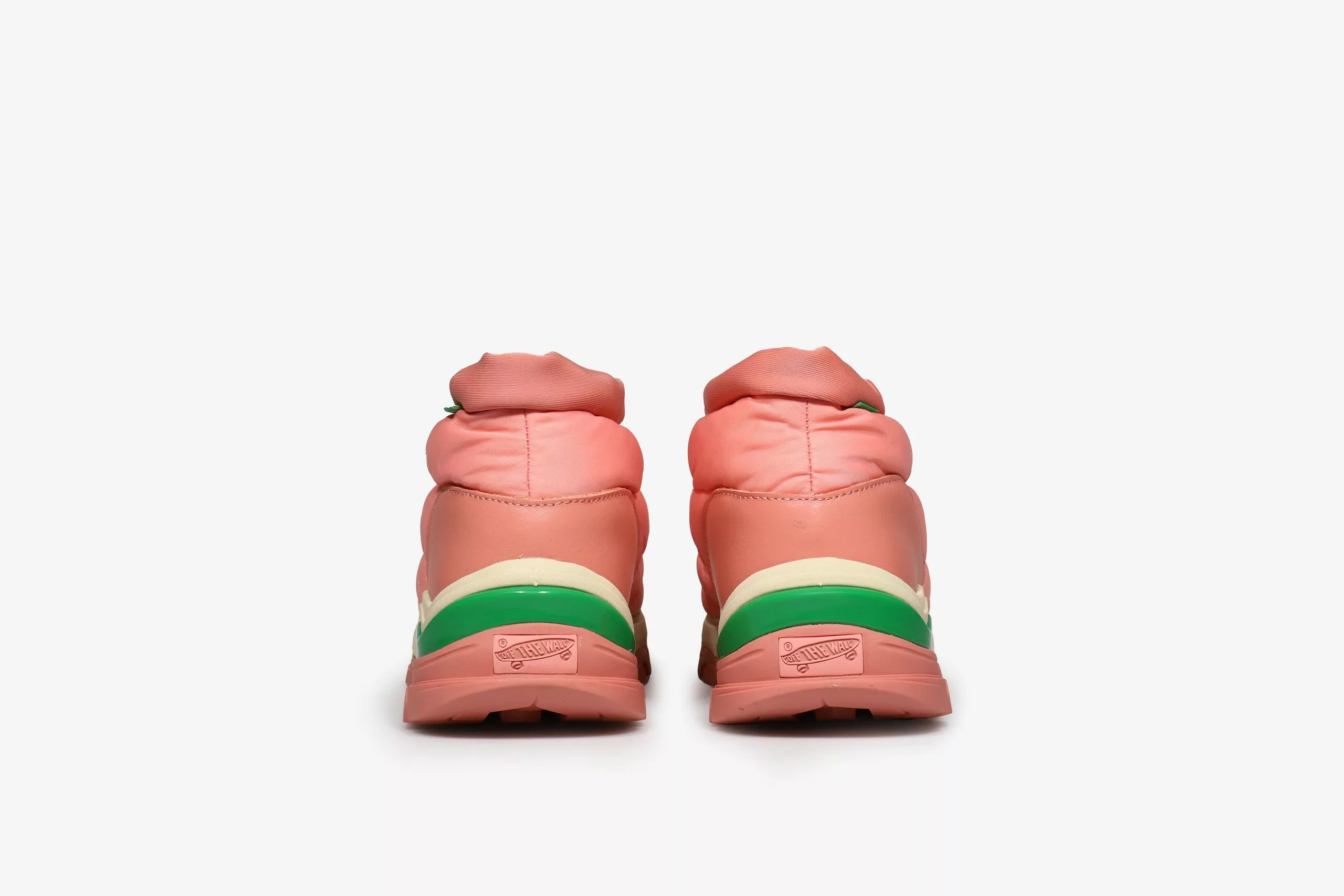 A winter silhouette brought back from the depths of the Vans Vault, boasting an insulated nylon quilt upper and heavy duty sole unit for tough terrain. An elastic fastening around the ankle provides insulation and easy access. The coral hues are a unique take on this particular shoe, breathing new life into this archive model. A pop of green in the midsole unit provides contrast to the predominantly monotone outfit.Â